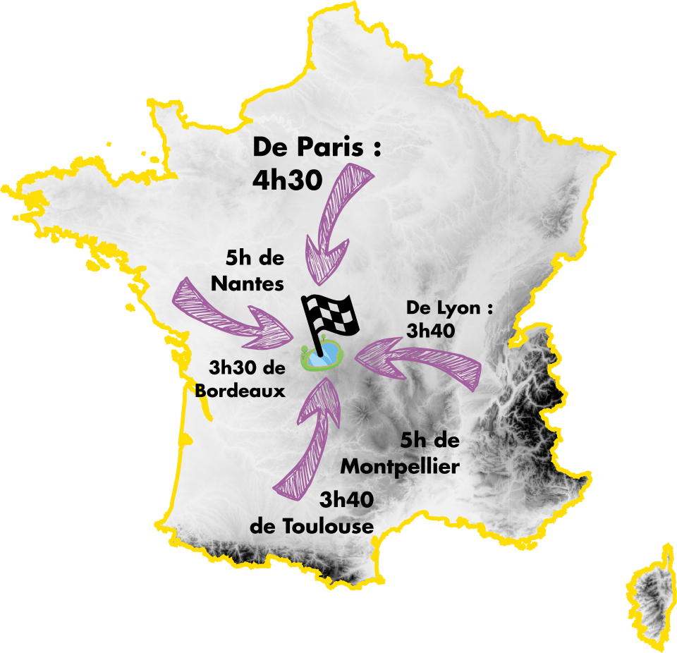 En plein milieu ! La Creuse est aussi proche des Nantais que des Montpelliérains, et aussi éloignée des Bordelais que des Lyonnais. Une fois l’autoroute derrière toi, c’est un cortège de voies communales qui t’attendent pour t’amener jusqu’aux abords du lac de Vassivière. Une première occasion de flâner et d’admirer le paysage. À moins que tu rejoignes les contrées du milieu en train ? Auquel cas, la gare d’Eymoutiers ne se situe qu’à une vingtaine de kilomètres du camp de base du Grand Tour de Creuse. Parfait pour délier les jambes sur ton vélo avant même le grand départ !
